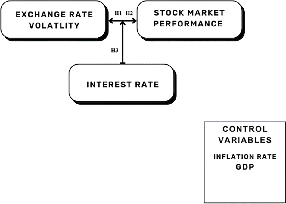 Liu and Lee (2020) tested the relationship between interest rate and exchange rate in both the Chinese market and the USA using VAR and dynamic stochastic general equilibrium (DSGE) model, with the assumption of operating in an open economy. Results showed that US monetary policies regarding interest rates have a significant impact on the exchange rate between China and the USA, while exchange rate volatility appears to have more impact on interest rates in the USA than interest rates in Hackeret al. (2009) studied the relationship between exchange rate and interest differential in seven different countries to find a negative relationship between the two. The methodology relied on a regression analysis model and on the following simple equation to represent the inverse relationship between the two variables. Furthermore, results showed that the significance of the relationship varied from one country to another. Therefore, prior research and established theories indicate the existence of a relationship between interest rate and exchange rate, as well as another relationship between interest rates and stock prices. Accordingly, this paper uses the interest rate as a moderator variable, which can interfere with the dynamic relationship between the exchange rate and stock prices. Consequently, based on the former argument we hypothesize: