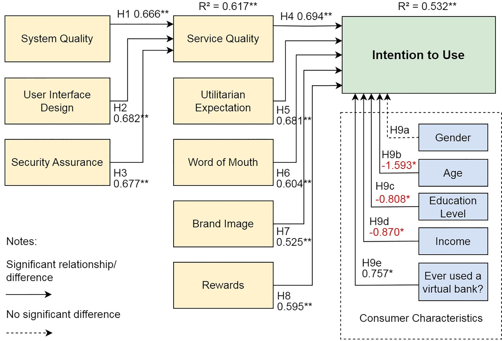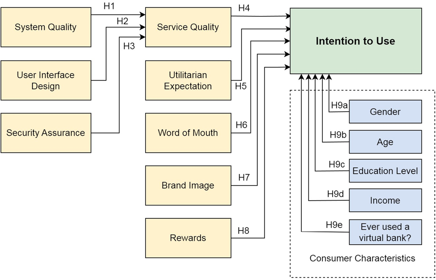 H9e: Previous use of virtual banks significantly affects usage intention.