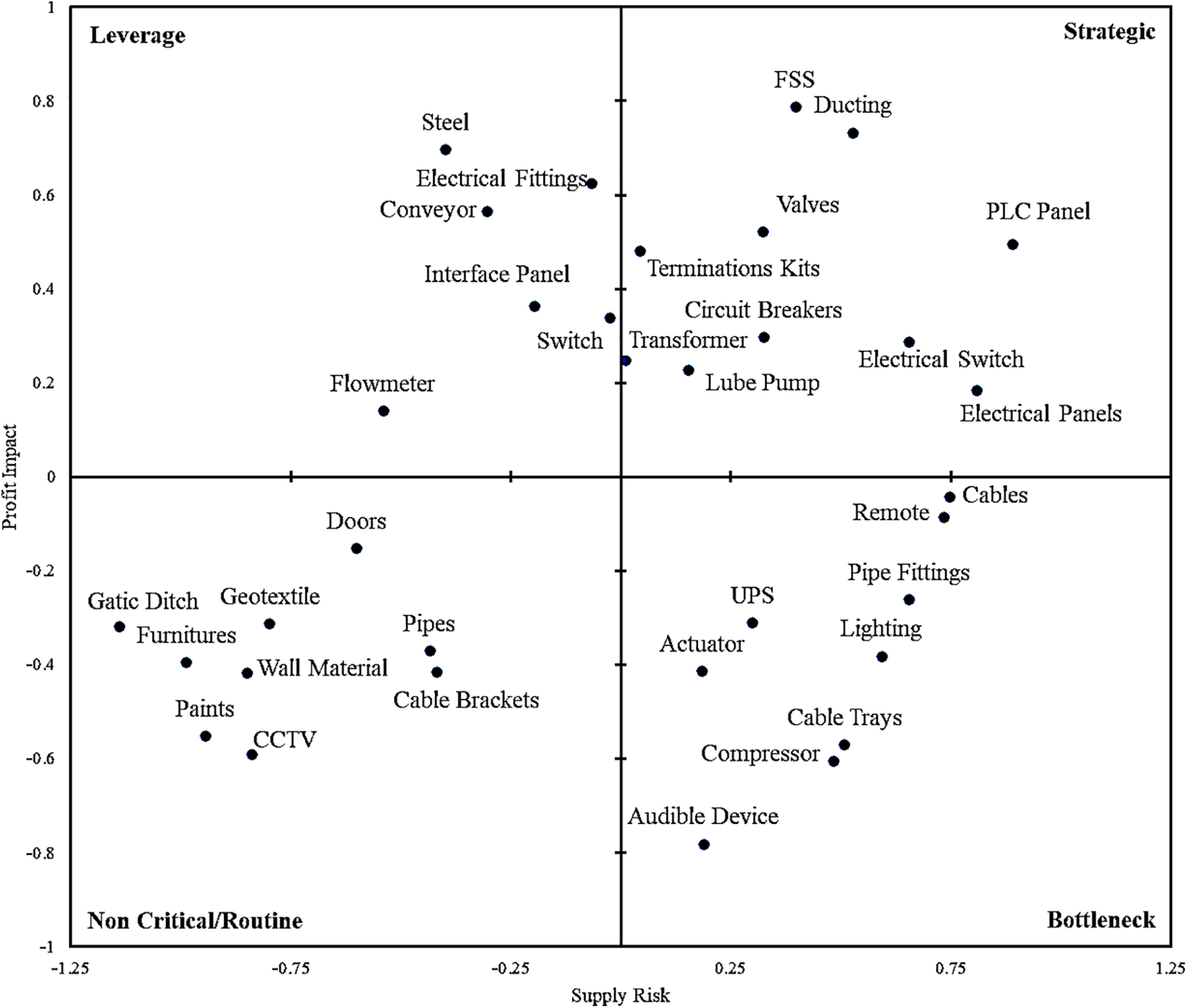 Non-critical or routine items like gatic ditch covers, geotextiles, furniture, wall materials, paints, CCTV, doors, pipes, and cable brackets have a low-profit impact and low supply risk. Although this class poses a low-profit impact and low supply risk, the total purchased value as shown in Table VII is moderately high at $ 1,058,170.00, which is even higher than leverage class items. The strategy for these items should focus on efficiency and cost- effectiveness.