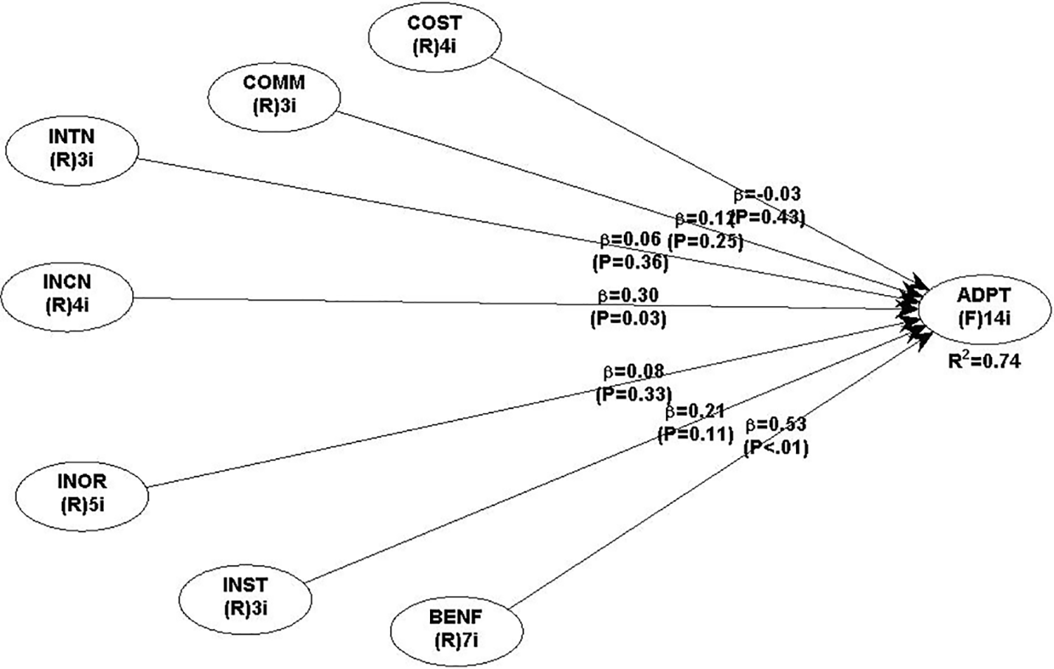Table IV shows that ICT adoption is significantly determined by the influence of consumer integration (0.299; p = 0.034) and usefulness (0.534, p = 0.000). While the factors of communication (0.117, p = 0.251), internal integration (0.064, p = 0.359), organizational integration (0.079, p = 0.328), strategic integration (0.209, p = 0.107), and cost (−0.032, p = 0.430) have no significant effect on ICT adoption by SMEs. The ICT adoption model in this study provides a determination value of 0.737, which is classified as high. The variation of integration factors with consumers and ICT usefulness is believed to determine 73.7% of ICT adoption decisions in business. These findings are presented in Fig. 1.