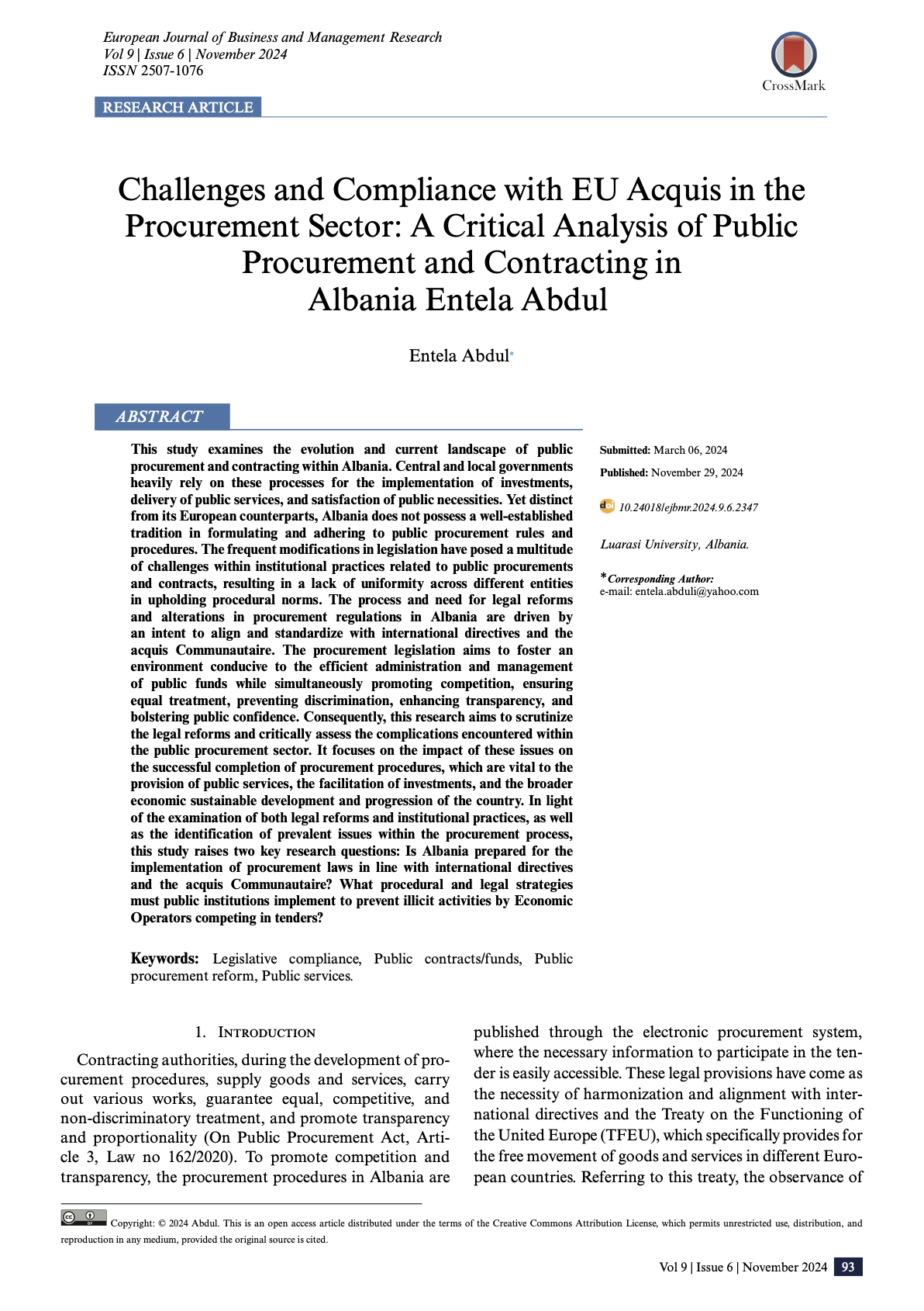 Challenges and Compliance with EU Acquis in the Procurement Sector: A Critical Analysis of Public Procurement and Contracting in Albania Entela Abdul